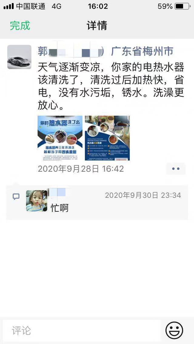 很快郭先生的宣傳就起來效果,開始慢慢越來越多客戶看到朋友圈來問郭先生關于水管清洗和家電清洗,一時間,郭先生就接到了6個單子。