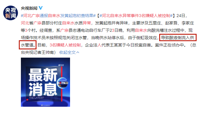 隨后公安機(jī)關(guān)立案?jìng)刹椴屹p10萬元,搜集污染源線索。現(xiàn)3名涉事者已經(jīng)被控制,案件正在偵辦中。初步調(diào)查結(jié)果稱,因?yàn)閺V宗縣一電動(dòng)自行車廠技術(shù)員未按照操作規(guī)范關(guān)閉注水管,當(dāng)晚供水站停水后,由于倒虹吸效應(yīng),導(dǎo)致酸液倒流入供水管道。