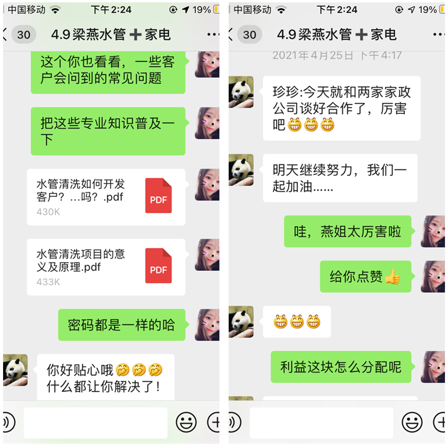 在收到設(shè)備之后,燕姐就馬上清洗了自家的水管與家電。在熟悉了基本的話術(shù)、專業(yè)知識和設(shè)備的操作之后,我們的業(yè)務(wù)員就開始指導(dǎo)燕姐去著手談渠道合作,燕姐執(zhí)行力強,立馬就去執(zhí)行,結(jié)果簽下了兩家與家政公司的合作。