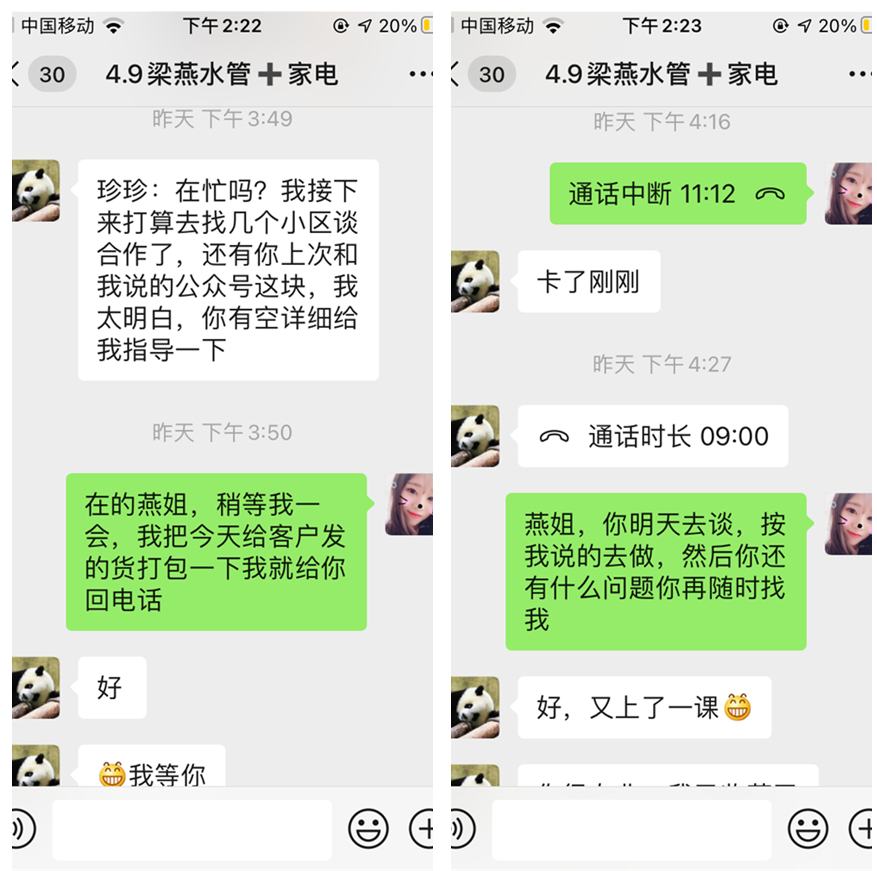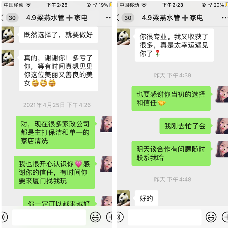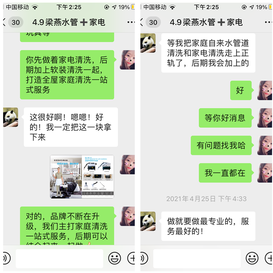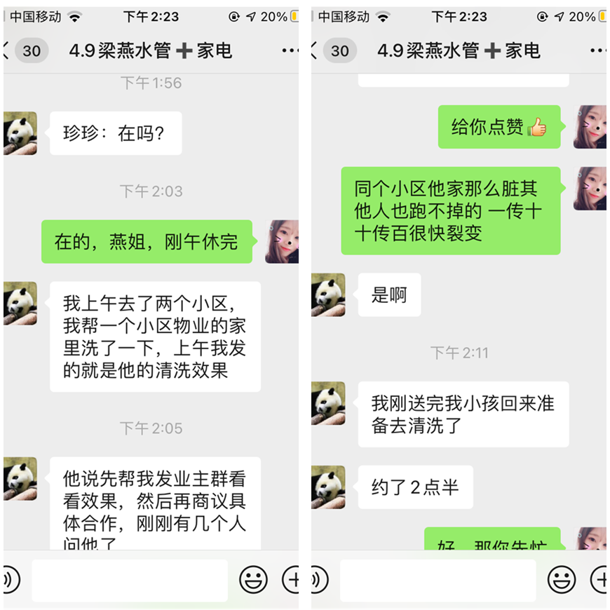 剛開始一天清洗一戶兩戶,慢慢的,單子越來越多,加上客戶的口碑宣傳轉(zhuǎn)介紹,之后燕姐又去談下了物業(yè)合作和公眾號平臺的渠道合作,在我們的市場扶持與燕姐自己的努力下,很快就把市場打開了,老客戶的轉(zhuǎn)介紹也越來越多,平均每天穩(wěn)定在清洗三四戶。