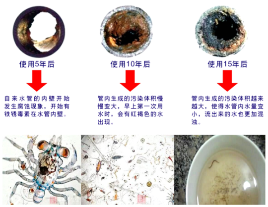 根據(jù)檢查公司的一份檢測(cè)報(bào)告顯示,自來水管清洗前的水質(zhì)比清洗后的水質(zhì),濁度高出6.5倍,由此可見平常的自來水雖然看起來清澈,但因?yàn)樽詠硭鼙诓匚奂{垢,因此水流會(huì)把管壁的卡垢一點(diǎn)一滴地帶出來,使自來水的濁度高出好幾倍。同時(shí)還檢測(cè)出自來水管的洗出水含有高達(dá)0.19ml/L的重金屬鉛成份,其它沒有列入檢驗(yàn)項(xiàng)目的重金屬成份,包括鐵、汞、砷、鎘,也可能隱藏在水管壁里面。根據(jù)清洗出來的污水顏色可以判斷水管里的污垢成份:塑料管容易屯積菌藻類的臟物,所以洗出來是白濁色或淺綠色或淺黃色,鐵管容易生鐵銹,所以洗出來是咖啡色;如果使用地下水,不管鐵管或塑料管,都可以洗出很黑的臟水。比較新的建筑物會(huì)使用不銹鋼管,但時(shí)間久了還是會(huì)洗出白濁黏稠的菌藻類。
