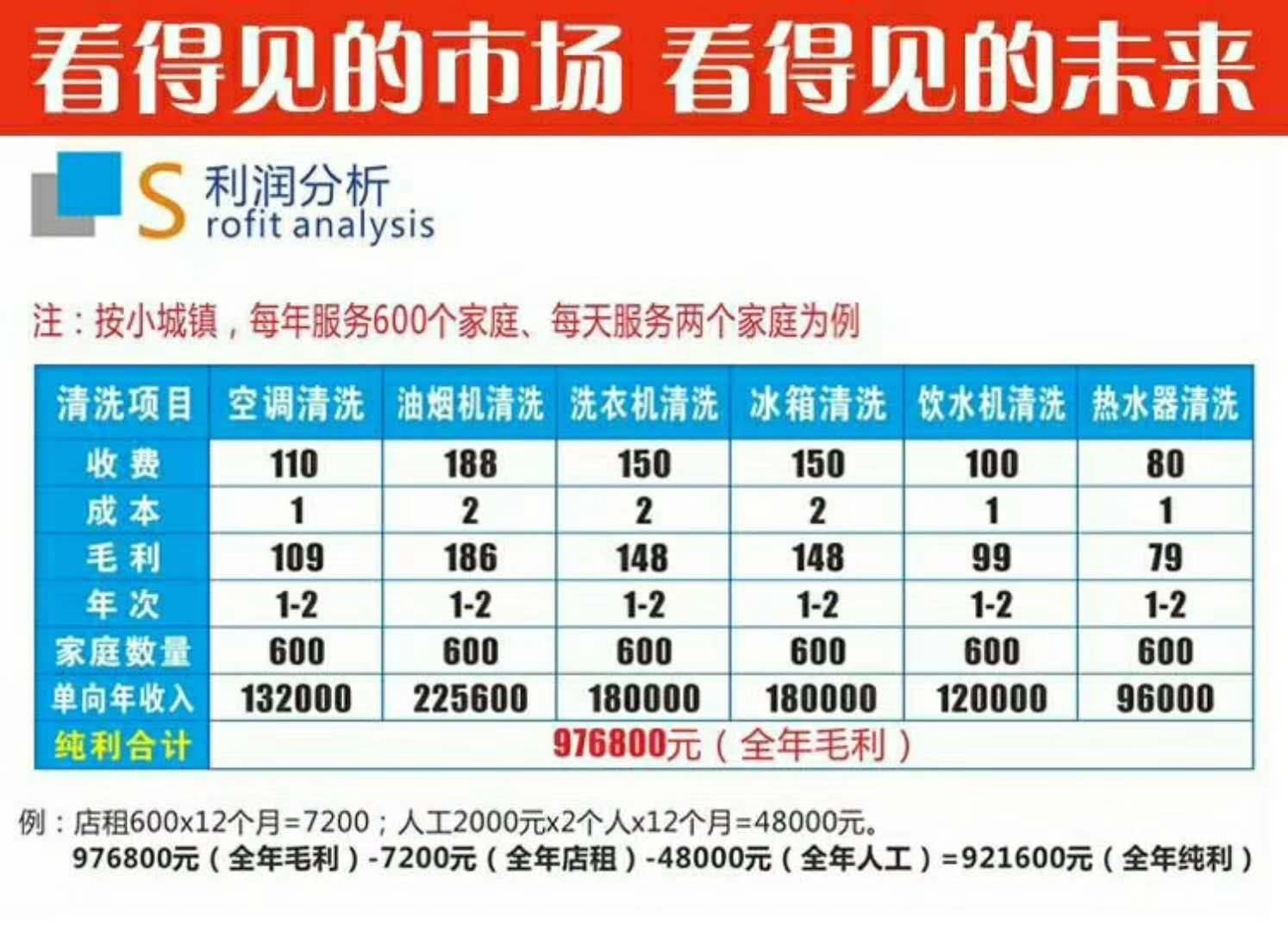 寶維家清洗服務(wù)+產(chǎn)品贈(zèng)送+產(chǎn)品銷售的模式,極易讓客戶養(yǎng)成定期消費(fèi)我們產(chǎn)品和服務(wù)的習(xí)慣,迅速在所在城市打開知名度,一個(gè)50萬(wàn)人口的縣城,保守估計(jì)5萬(wàn)個(gè)家庭,以20%家庭消費(fèi)我們?nèi)盗械漠a(chǎn)品以及服務(wù)200元計(jì)算,縣級(jí)城市1年的市場(chǎng)份額為5萬(wàn)*20%*200=200萬(wàn)元。無(wú)論是客戶需要電器的保養(yǎng)產(chǎn)品或是服務(wù),都潛意識(shí)的想到寶維家,家電清洗市場(chǎng)發(fā)展?jié)摿薮蟆?/p>