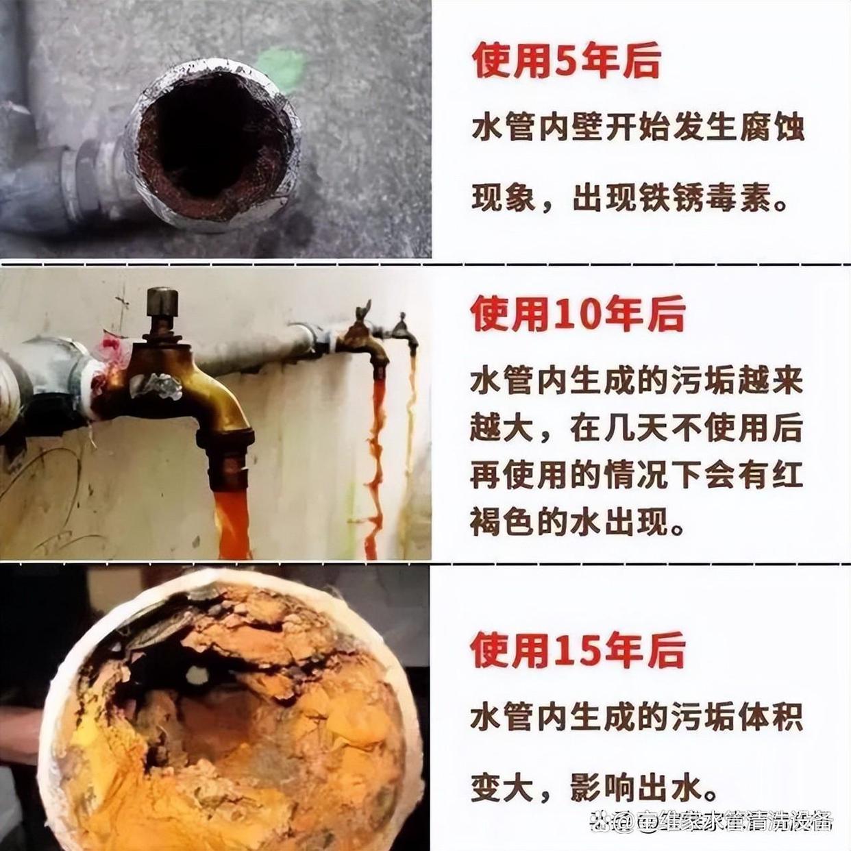 那么,多長時間清洗一次水管比較合適呢?因為造成自來水管道污染的原因都與自來水的水質和水壓等有關。一般來說,如果這個地區的整體水質比較硬,雜質比較多,水管就比較容易臟,清洗的頻率也比較頻繁。在水質較差的地方,一年可清洗兩次。常見省份如山西、河南、貴州、江蘇等。對于水質一般的地區,建議每年清洗一次,對于水質較好的地方,可以1—2年清洗一次。